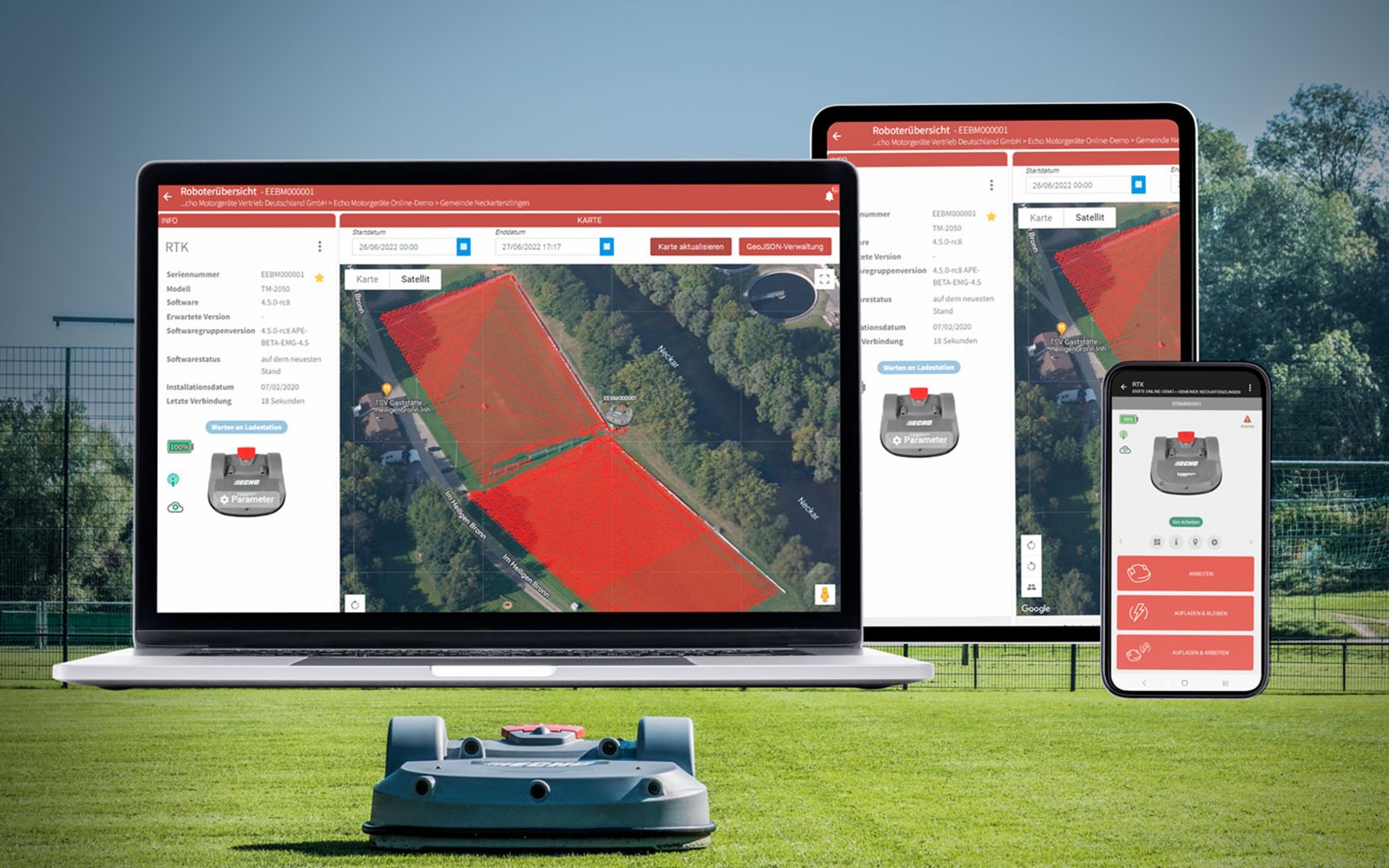 Für fast jedes Gerät bietet ECHO Robotics die passende Anbindung. Allen voran das Webportal und die Apps treiben unsere Vision vom DIGITAL ROBOTICS GREENKEEPING. Über den Webbrowser und die Smartphone-Apps steuern Sie bereits heute fast alle Funktionen, die unsere Roboter auszeichnen. Mit unseren regelmäßigen Softwareupdates für das Webportal, die Smartphone-Apps und den Roboter erweitern wir den Funktionsumfang. Da die Roboterhardware durch ihre modulare Architektur upgradefähig entworfen wurde und die Software einfach aktualisiert werden kann, bleibt Ihre langfristig Investition geschützt. Ein Ökosystem getrimmt auf Großflächenrobotik durch und durch.
