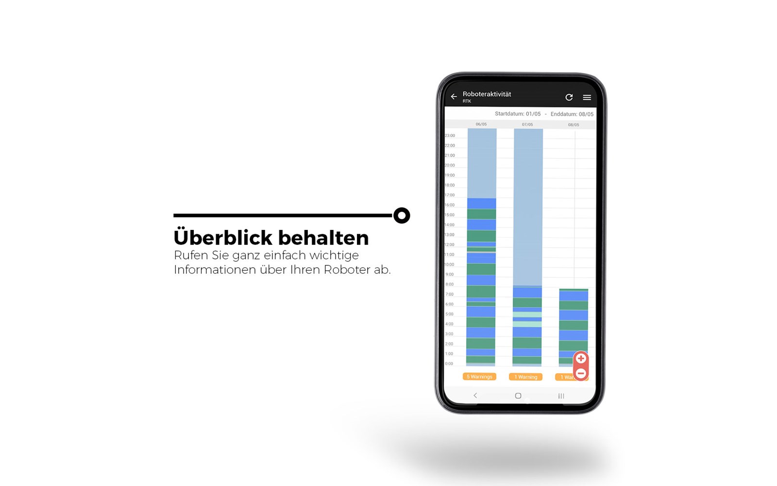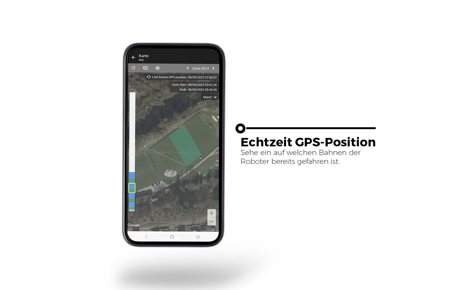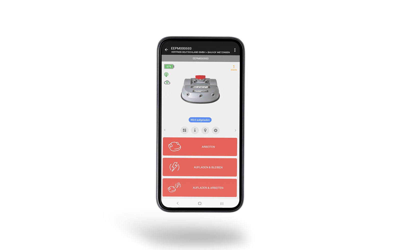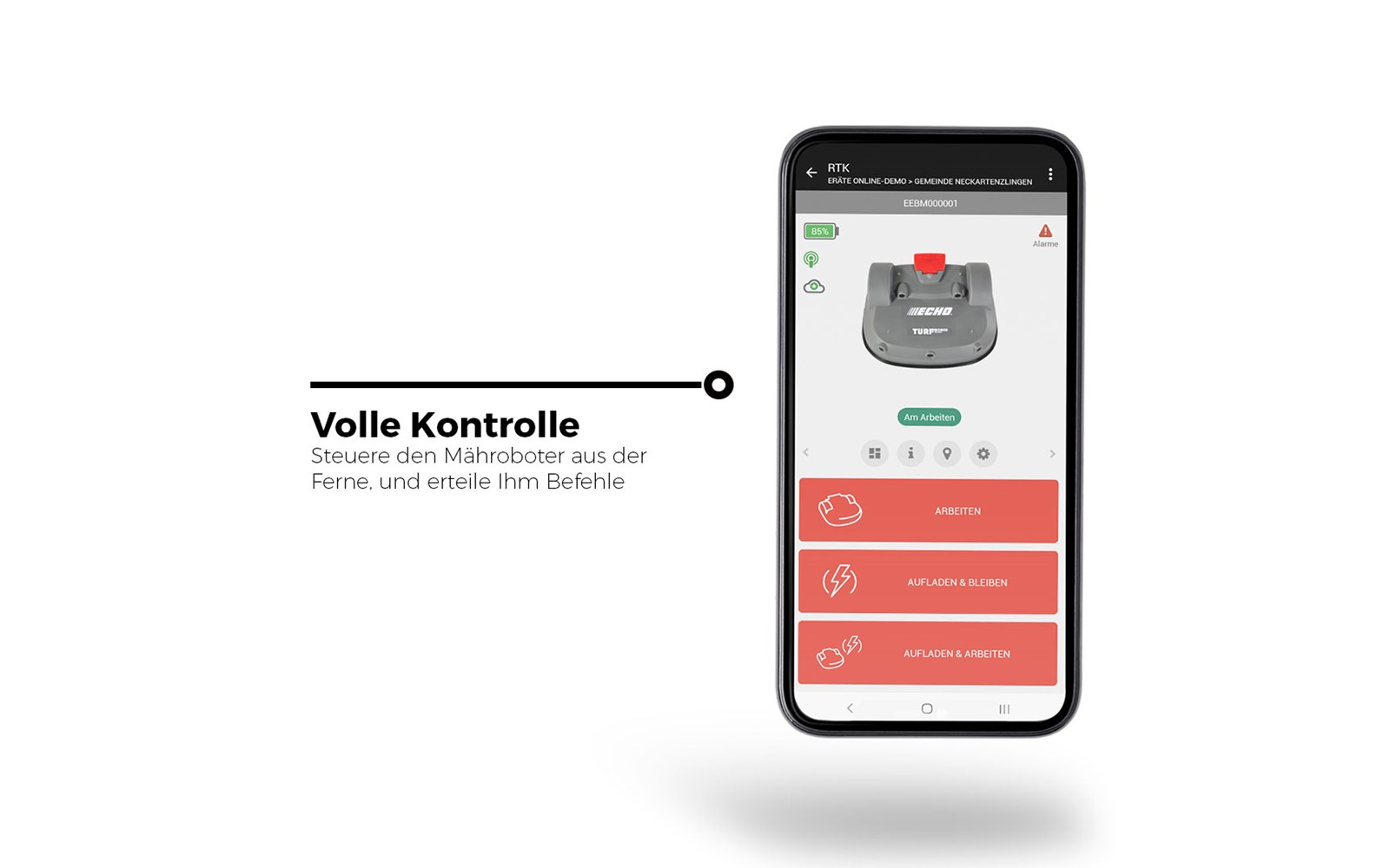 Die ECHO Robotics App für Android und iOS ist die perfekte Ergänzung zum Roboter und unserem Webportal. Mit ihr verfolgen Sie Ihren Roboterstatus, ändern Sie die Konfiguration oder Fernsteuern den Roboter, um GPS-definierte Zonen oder Verbotszonen anzulegen.