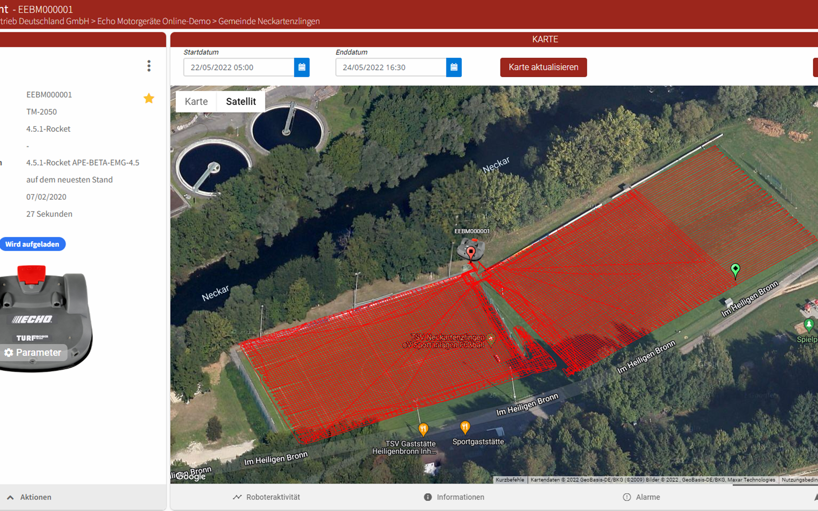 Die Software von ECHO Robotics ermöglicht es, die Musternavigation egal wie die Formgebung des gesamten Platzes mit etwaigen Nebenflächen ist, perfekt auf den Fußballplatz auszurichten. Die Anzahl der Laufrichtungen und Winkel können vor Ort, per Webportal oder App geändert werden.